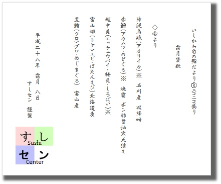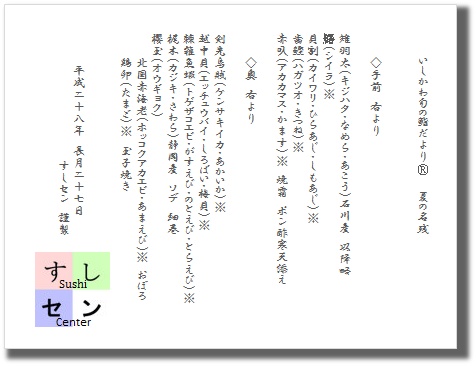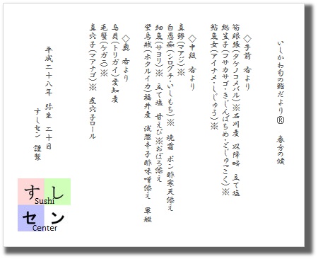 てネタには「まつ」いか、マコモ「タケ」、「梅」貝を織り込み